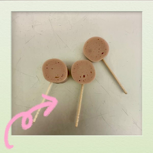 ① 魚肉ソーセージを12等の輪切りにし、爪楊枝を刺す