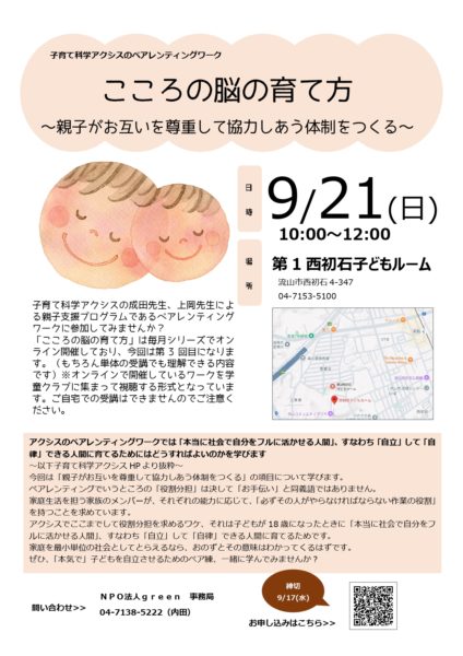 このたび、私たちNPO法人greenでは、学童クラブの保護者の皆さまを対象に、「子育て科学アクシス」主催のオンライン研修への参加募集を行います。